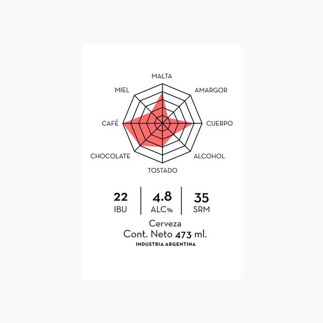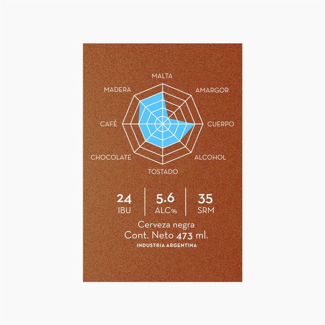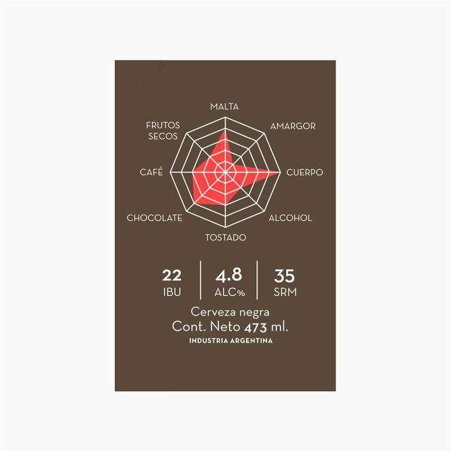 Notas a café, chocolate y frutos secos se expresan en esta cerveza negra de amargor medio y notable cuerpo. Apta desayuno, merienda y cena.